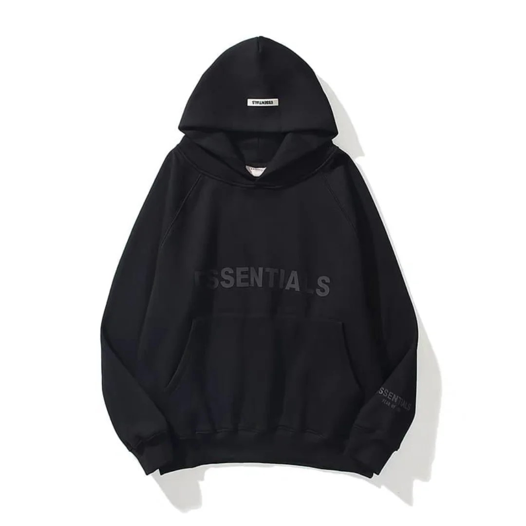 The Essentials Black Hoodie is a stylish and versatile wardrobe staple. Made from premium quality fabric, it features a relaxed fit, a kangaroo pocket, and ribbed cuffs and hem for comfort. The hoodie showcases the iconic "ESSENTIALS" branding subtly embossed on the chest and sleeve, along with a signature label on the hood. Perfect for casual wear, it combines streetwear aesthetics with everyday practicality.