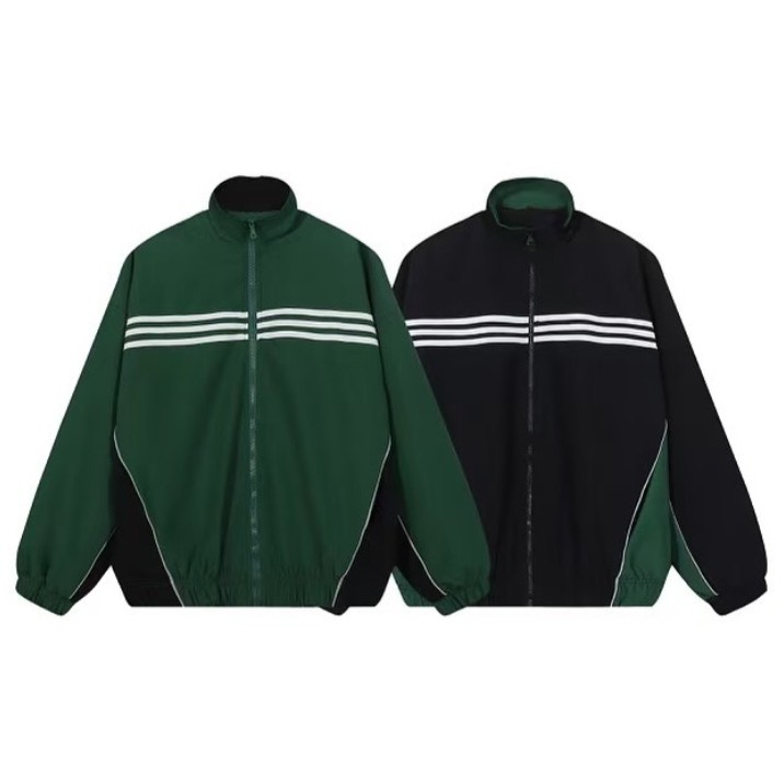 These are sporty, retro-style track jackets in green and black color variations. Both jackets feature a high collar, a full-length zipper, and elastic cuffs and hem. A set of three white horizontal stripes runs across the chest, adding a classic athletic touch. The jackets also have subtle white piping along the sleeves and sides, enhancing their design. They appear to be made of lightweight, breathable material, making them ideal for casual wear or sports activities.
